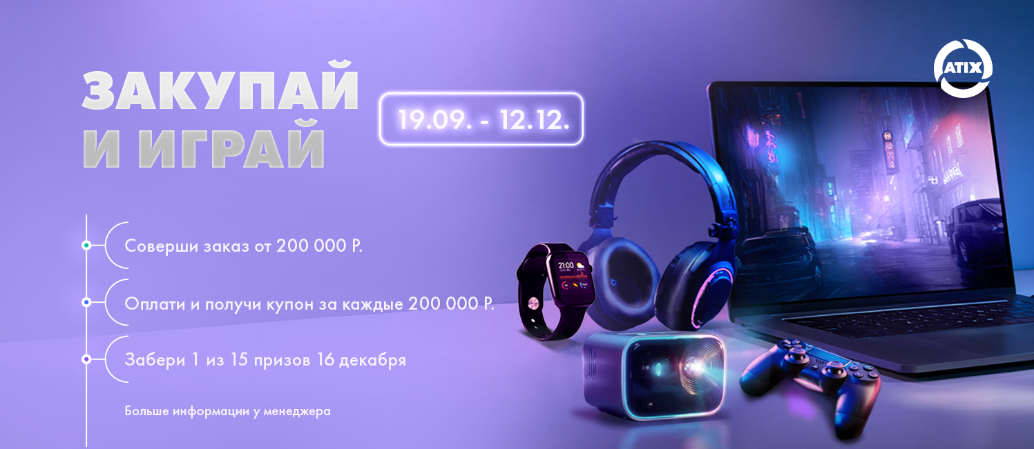 С 19 сентября по 12 декабря участвуйте в грандиозной акции от ATIX и получите шанс выиграть один из этих потрясающих гаджетов. Просто совершите заказ оборудования ATIX в период проведения акции – и автоматически становитесь участником. Не упустите возможность преобразить свои цифровые впечатления и добавить ярких красок в повседневную жизнь!